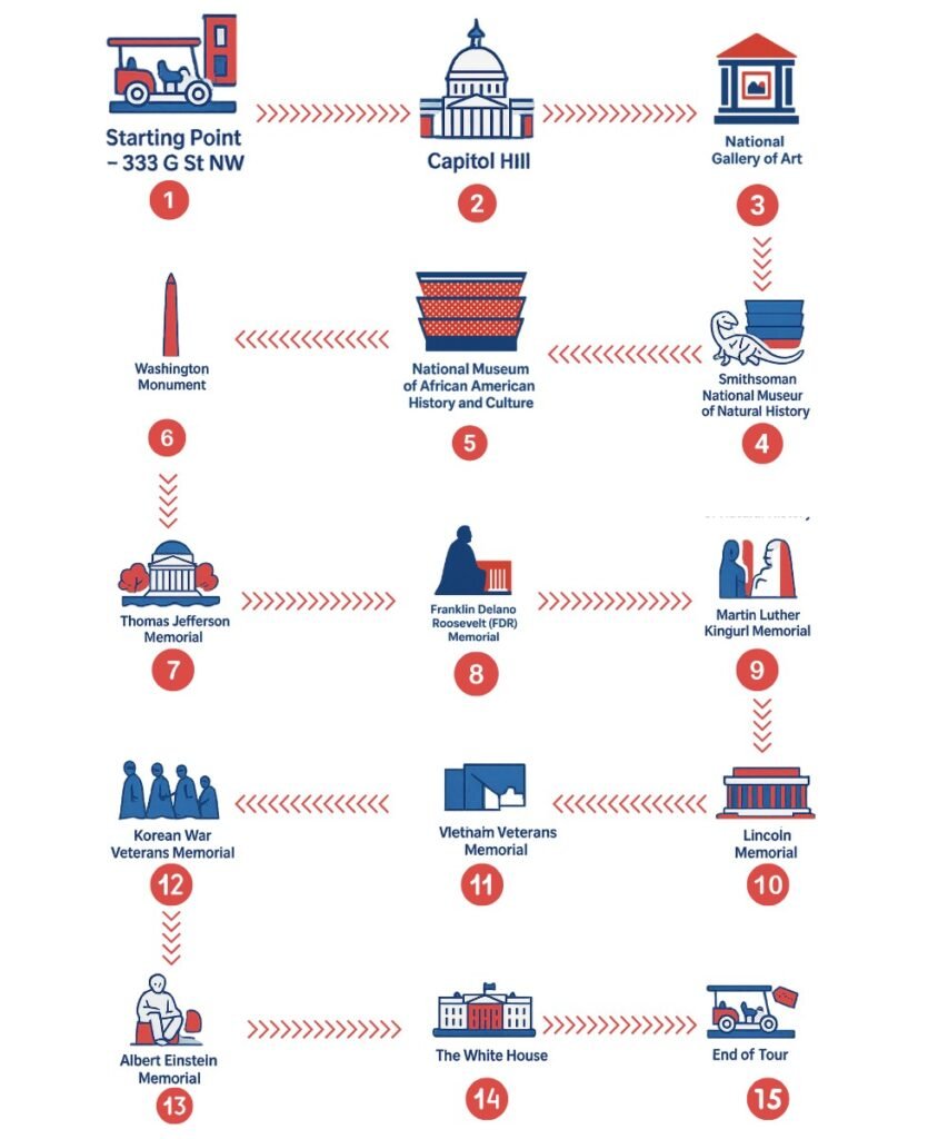 The tour ends back at 333 G St NW. This is your drop-off point and final photo opportunity with the guide and the cart.